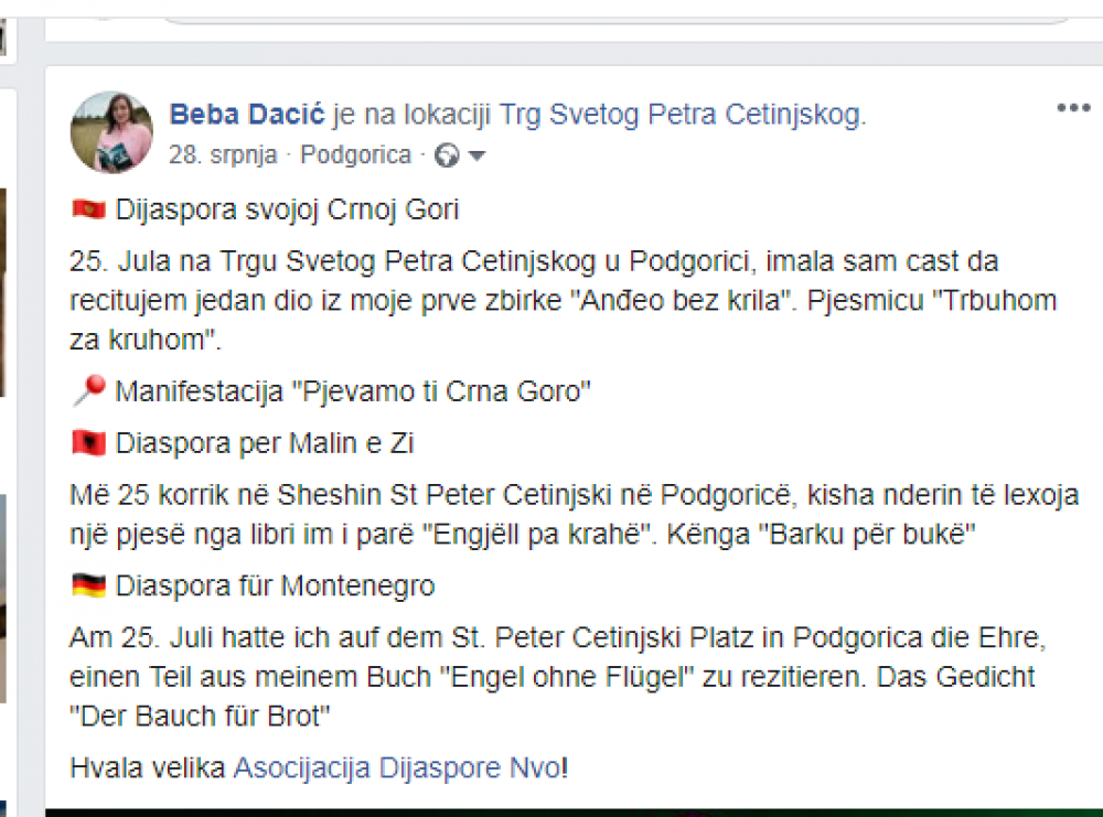 Më 25 korrik në Sheshin St Peter Cetinjski në Podgoricë, kisha nderin të lexoja një pjesë nga libri im i parë "Engjëll pa krahë". Kënga "Barku për bukë"