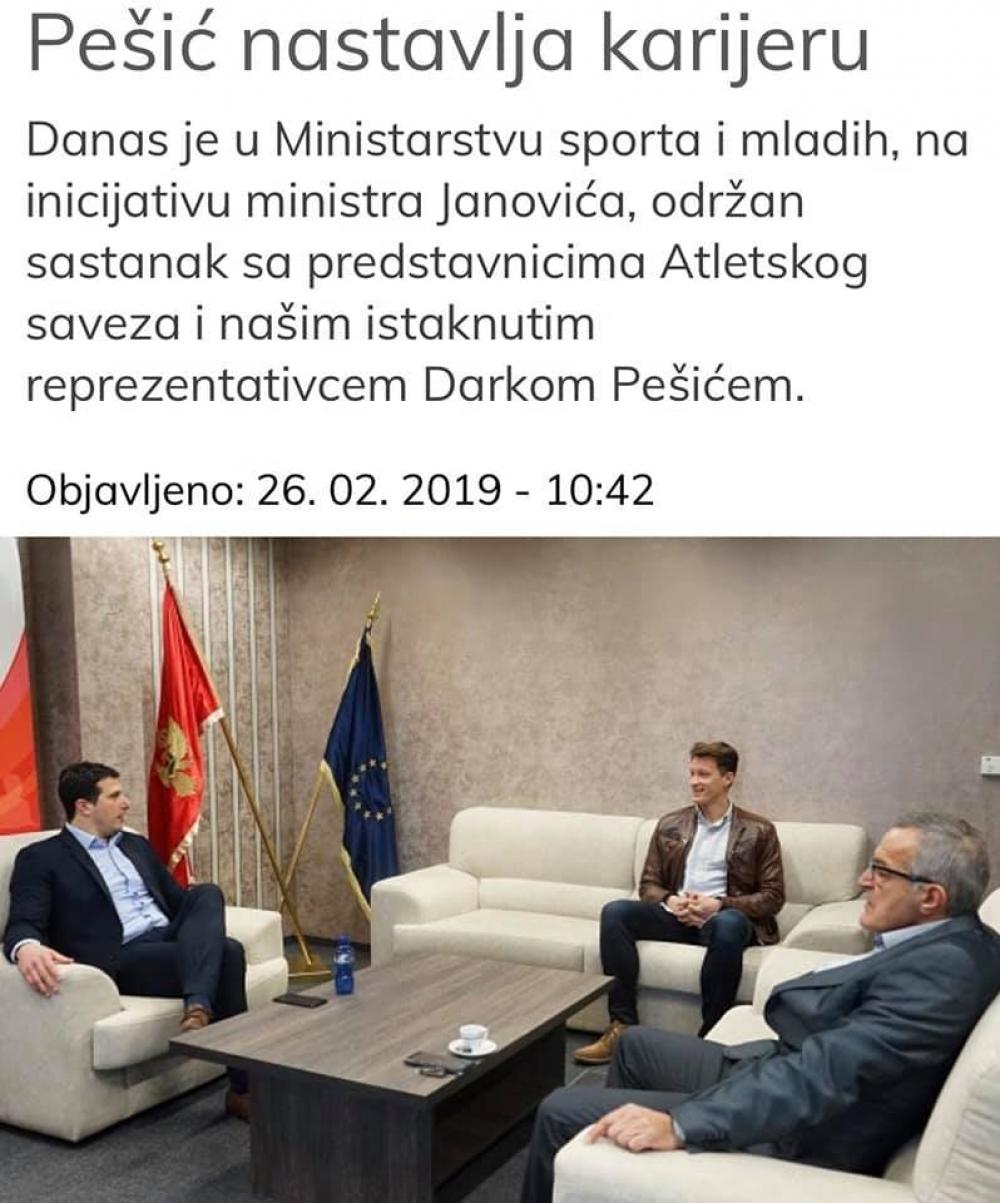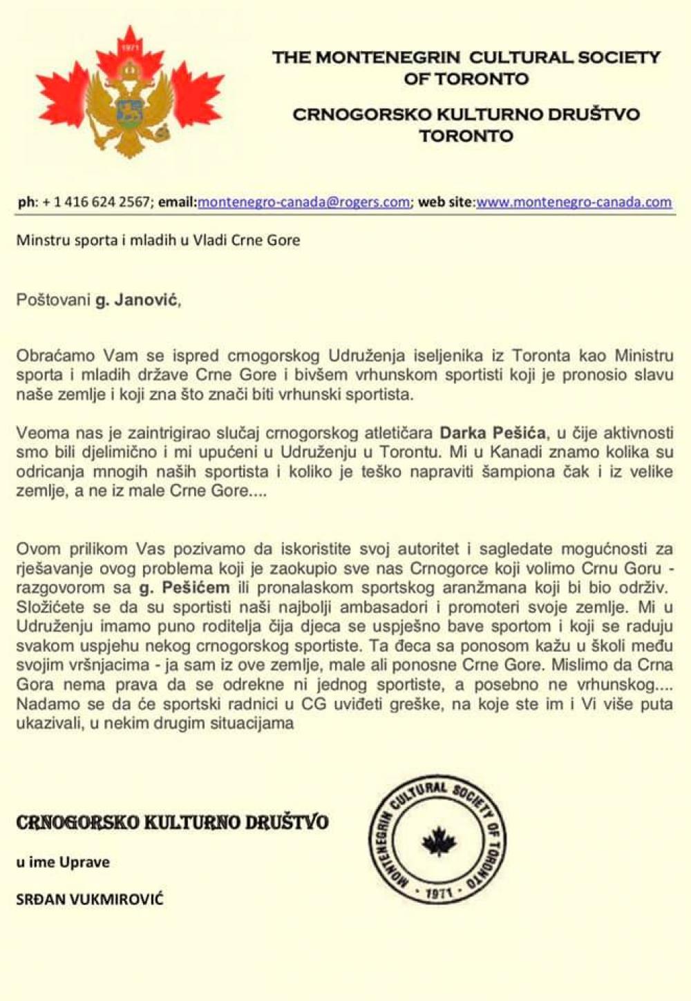 CRNOGORSKO KULTURNO DRUSTVO TORONTO-Jedan od bezbroj postupaka nase dijaspore-iseljenika,kojim pokazuju da su sastavni dio drzave Crne Gore ,bez obzira đe da žive ...da se sva desavanja dobra ili losa u Crnoj Gori reflektuju i na njih...da prepoznaju i sa dobrom namjerom ukazuju na eventualne propuste ,kao sto je u konkretnom slucaju bio slucaj sa nasim istaknutim reprezentativcem Darkom Pesicem.Zahvaljujuci clanovima Crnogorsko Kulturnog Drustva Toronto Ministar sporta gospodin Janovic je danas primio Darka Pesica i iz direktne komunikacije sa njim i predstavnicima Atletskog saveza CG podrzao nastavak sportske karijere naeg istaknutig reprezentativca koji je izjavio da ce nastaviti da brani boje svoje drzave na najprestiznijim medjunarodnim atletskim takmicenjima.