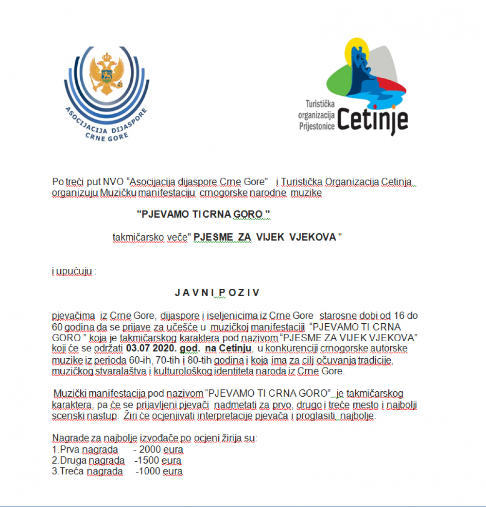 pjevačima iz Crne Gore, dijaspore i iseljenicima iz Crne Gore starosne dobi od 16 do 60 godina da se prijave za učešće u muzičkoj manifestaciji “PJEVAMO TI CRNA GORO ” koja je takmičarskog karaktera pod nazivom “PJESME ZA VIJEK VJEKOVA” koji će se održati 03.07 2020. god. na Cetinju, u konkurenciji crnogorske autorske muzike iz perioda 60-ih, 70-tih i 80-tih godina i koja ima za cilj očuvanja tradicije, muzičkog stvaralaštva i kulturološkog identiteta naroda iz Crne Gore.