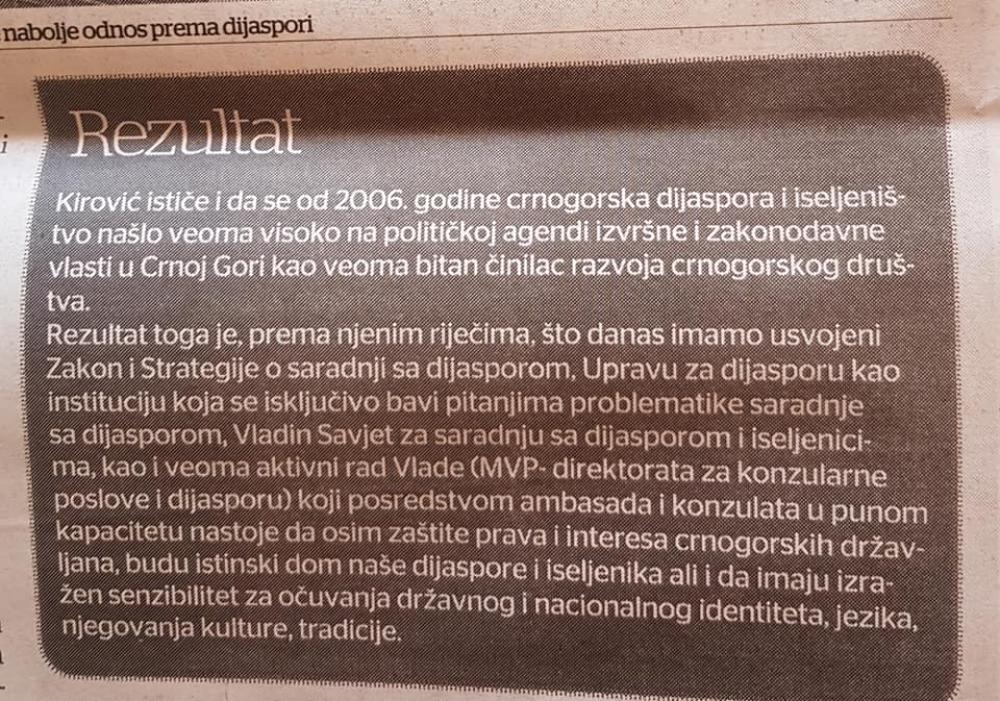 Od 2006. na ovamo crnogorska dijaspora i iseljeništvo se našlo veoma visoko na političkoj agendi izvršne i zakonodavne vlasti u Crnoj Gori kao veoma bitan činilac razvoja crnogorskog društva, pa danas imamo usvojeni Zakon i Strategije o saradnji sa dijasporom, Upravu za dijasporu instituciju koja se iskljucivo bavi pitanjima problematike saradnje sa dijasporom , Vladin Savjet za saradnju sa dijasporom i iseljenicima , kao i veoma aktivni rad Vlade Crne Gore –MVP-Direktorata za konzularne poslove i dijasporu koji posredstvom ambasada i konzulata u punom kapacitetu nastoje da naša DKP-a u svijetu, osim zaštite prava i interesa crnogorskih državljana, budu istinski dom naše dijaspore I iseljenika sa izražem senzibilitetom u cilju očuvanja njihovog državnog i nacionalnog identiteta, jezika, njegovanja kulture, tradicije .