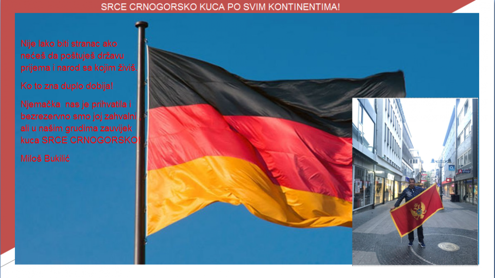Od naše dijaspore mnogi od nas mogu da uče kako se voli Crna Gora , njena tradicija , istorija , kultura , državni simboli i institucije sistema . Odlazeći u neke druge države tuđe, a opet svoje oni poštuju zakone, državne simbole I institucije država prijema i kažu :”Nije lako biti stranac u tuđoj državi , ako nećeš da poštuješ državu prijema i narod sa kojim živiš. Ko to zna, duplo dobija! Ova država nas je prihvatila i bezrezervno smo joj zahvalni , ali u našim grudima zauvijek kuca SRCE CRNOGORSKO! “Nek nam ove riječi budu putokaz za dalje da možemo živjeti bez podjela nametnutih ili samoizabranih …da sa ponosom ističemo Crnu Goru i njene državne simbole jer Crna Gora je dom svih nas bez obzira đe i na koji način se molimo onom u kojeg vjerujemo!