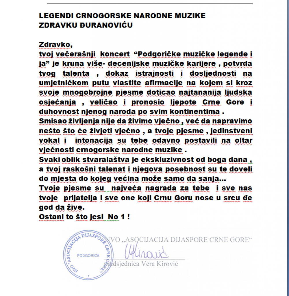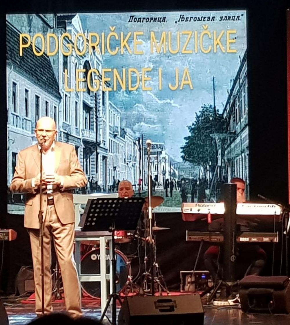 tvoj večerašnji koncert “Podgoričke muzičke legende i ja” je kruna više- decenijske muzičke karijere , potvrda tvog talenta , dokaz istrajnosti i dosljednosti na umjetničkom putu vlastite afirmacije na kojem si kroz svoje mnogobrojne pjesme doticao najtananija ljudska osjećanja , veličao i pronosio ljepote Crne Gore i duhovnost njenog naroda po svim kontinentima .