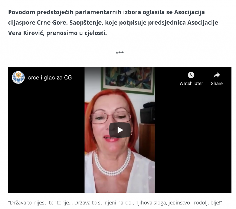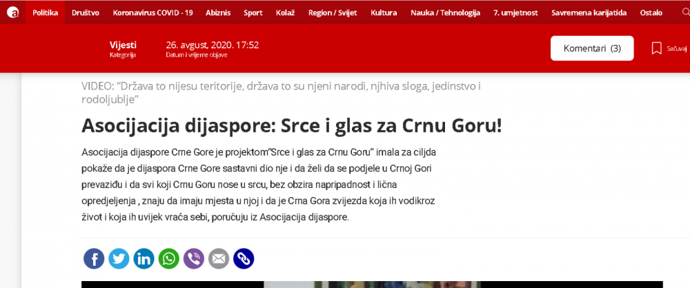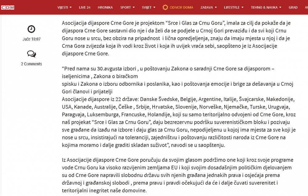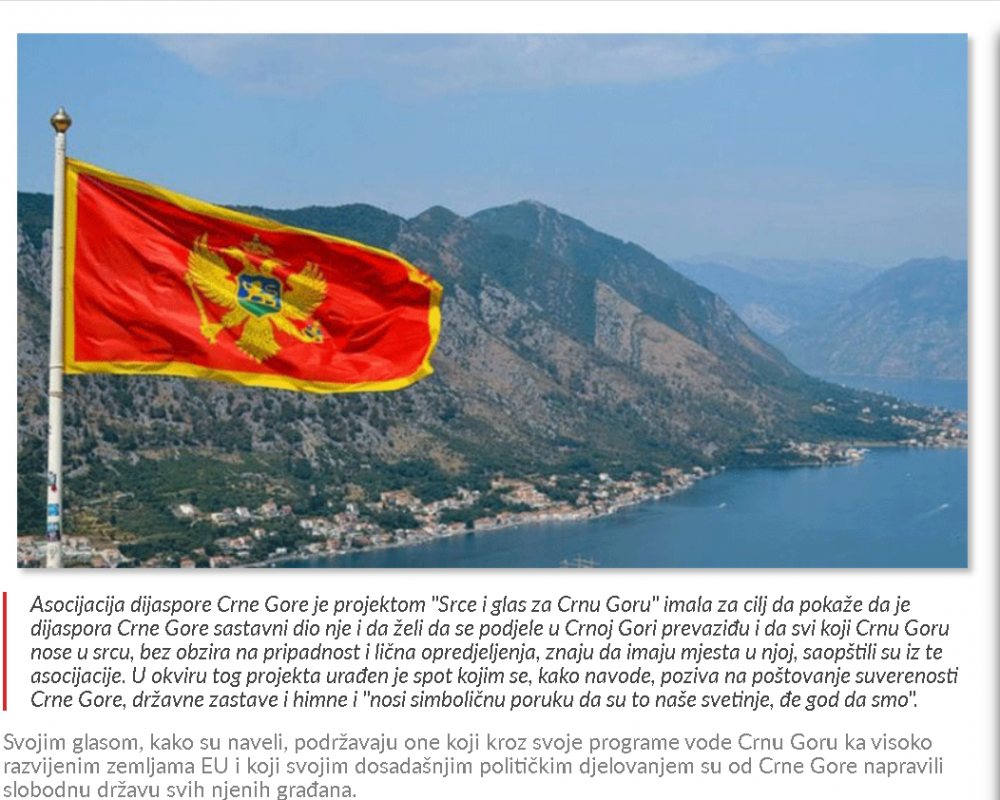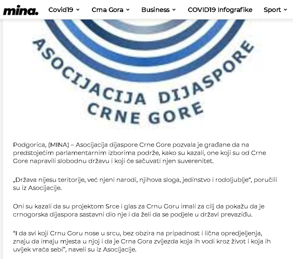 Naš projekat SRCE I GLAS ZA CRNU GORU je izazvao ogromno interesovanje i dobio podršku kako u Crnoj Gori tako i dijaspori, što se da vidjeti iz broja pregleda na portalima i porukama podrške i čestitki koje dobijamo . Saopštenje o projektu su prenijeli MINA -NEWS, PORTAL ANALITIKA, VIJESTI,CDM, RT NIKŠIĆ, BAR-INFO,RTCG ... ovim putem se svima u svoje lično ime i u ime članova Asocijacije dijaspore CG zahvaljujem .