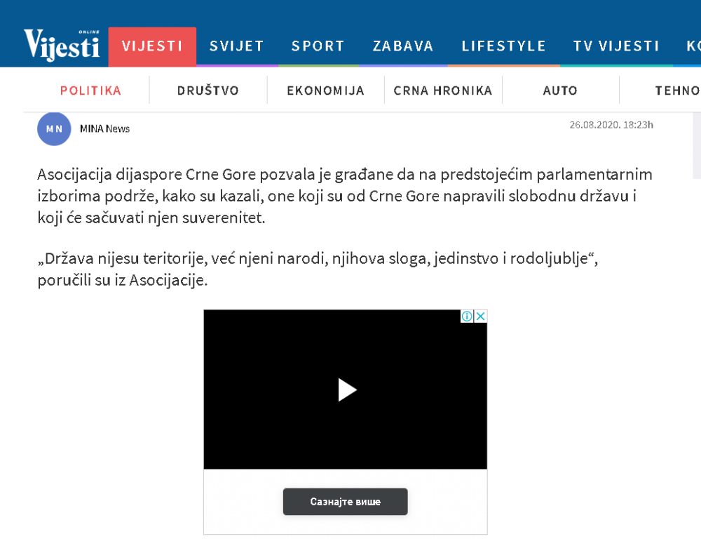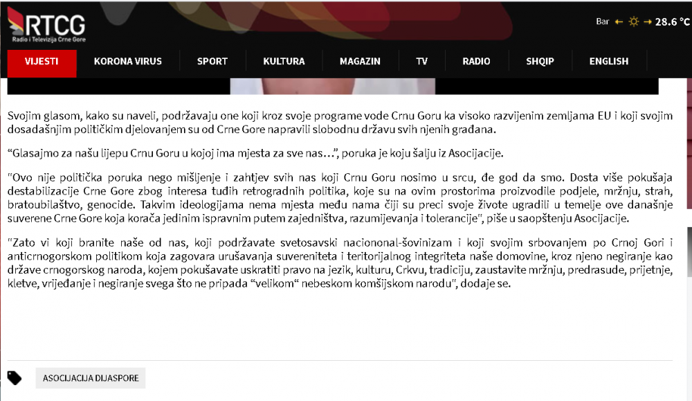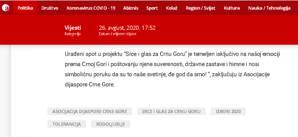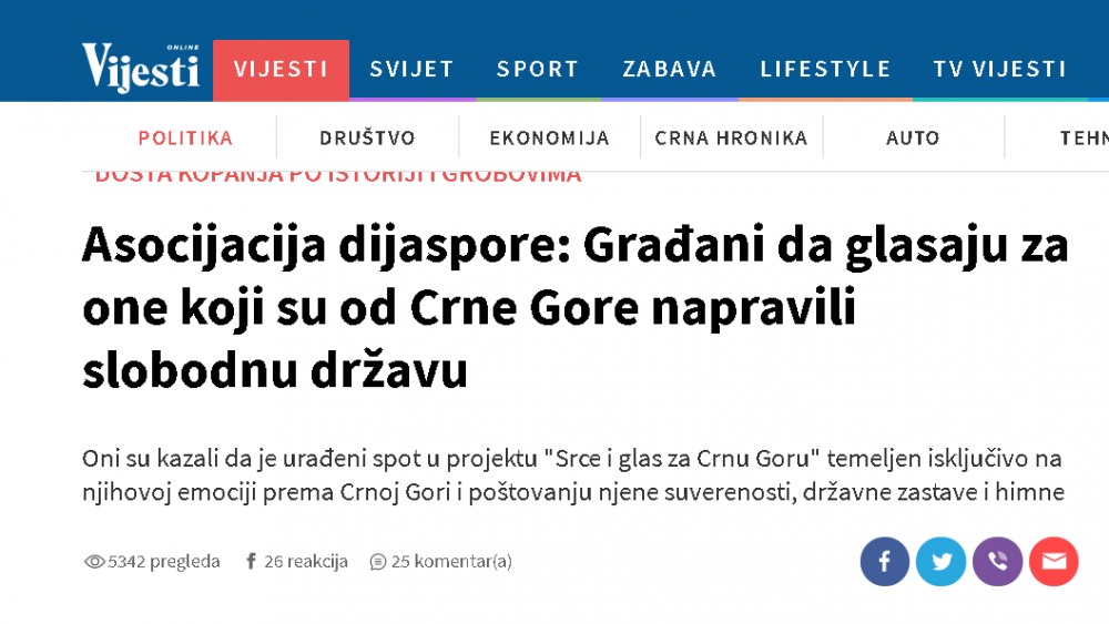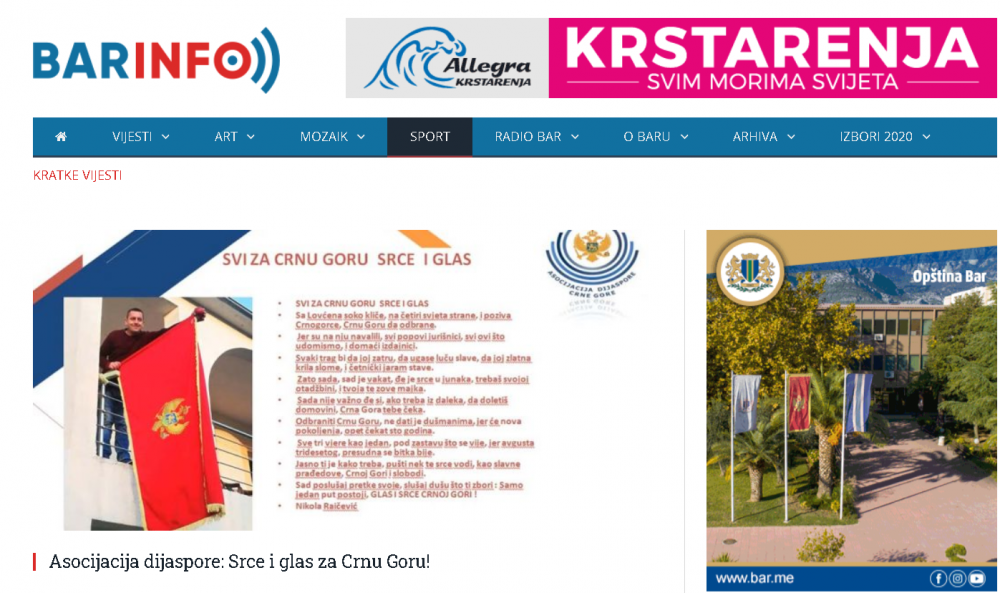 Naš projekat SRCE I GLAS ZA CRNU GORU je izazvao ogromno interesovanje i dobio podršku kako u Crnoj Gori tako i dijaspori, što se da vidjeti iz broja pregleda na portalima i porukama podrške i čestitki koje dobijamo . Saopštenje o projektu su prenijeli MINA -NEWS, PORTAL ANALITIKA, VIJESTI,CDM, RT NIKŠIĆ, BAR-INFO,RTCG ... ovim putem se svima u svoje lično ime i u ime članova Asocijacije dijaspore CG zahvaljujem .