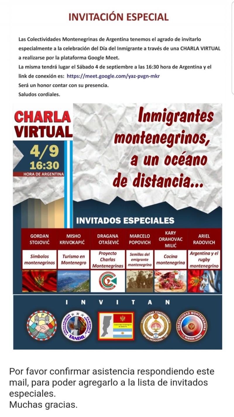 Saludos a todos los miembros de la comunidad montenegrina de Argentina y a todos los miembros de la Asociación de la Diáspora en los países de América Latina - Argentina, Uruguay, Perú, Paraguay, a quienes felicito el Día del Inmigrante en mi propio nombre y en el de los miembros del Asociación Diáspora.