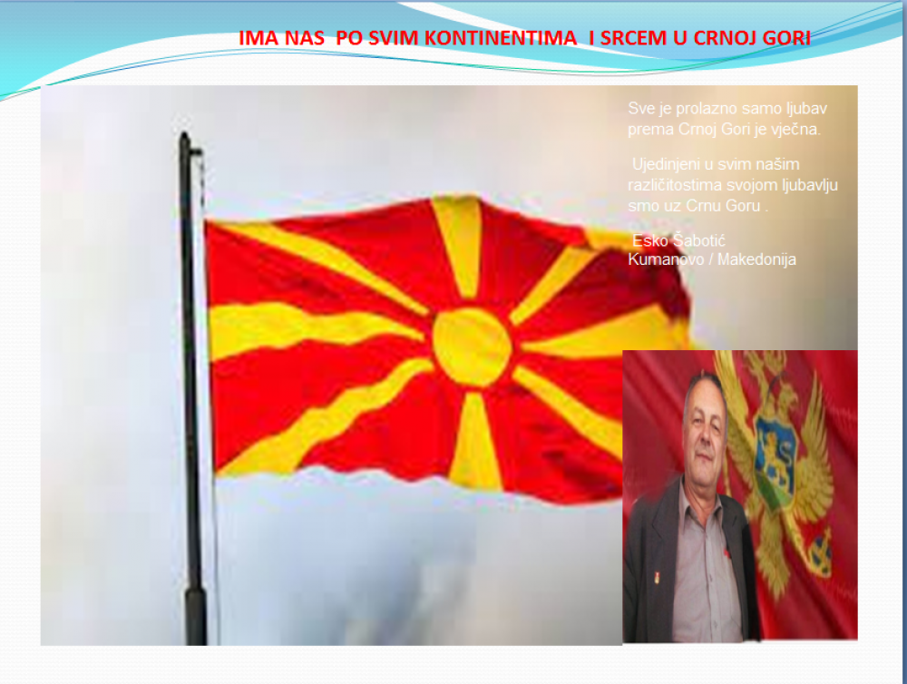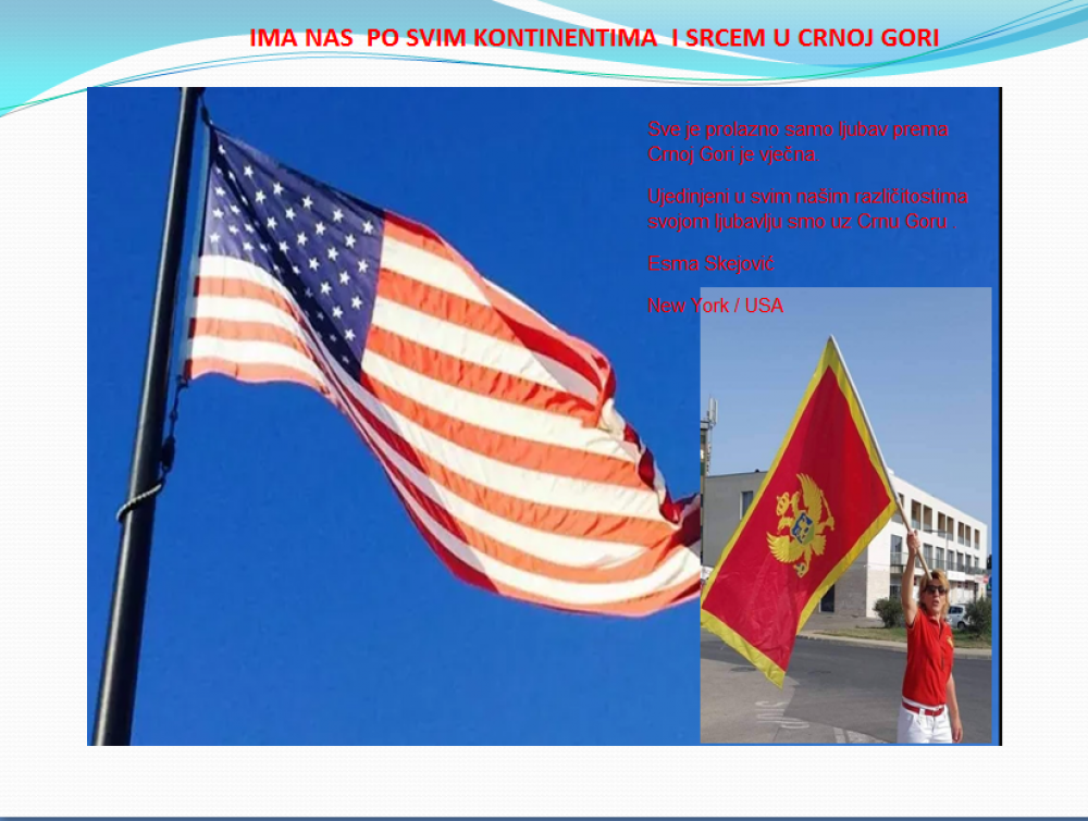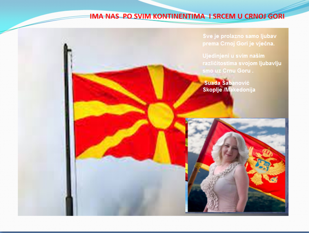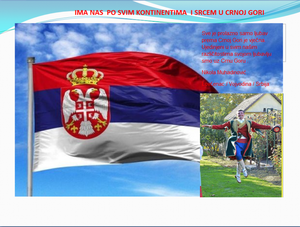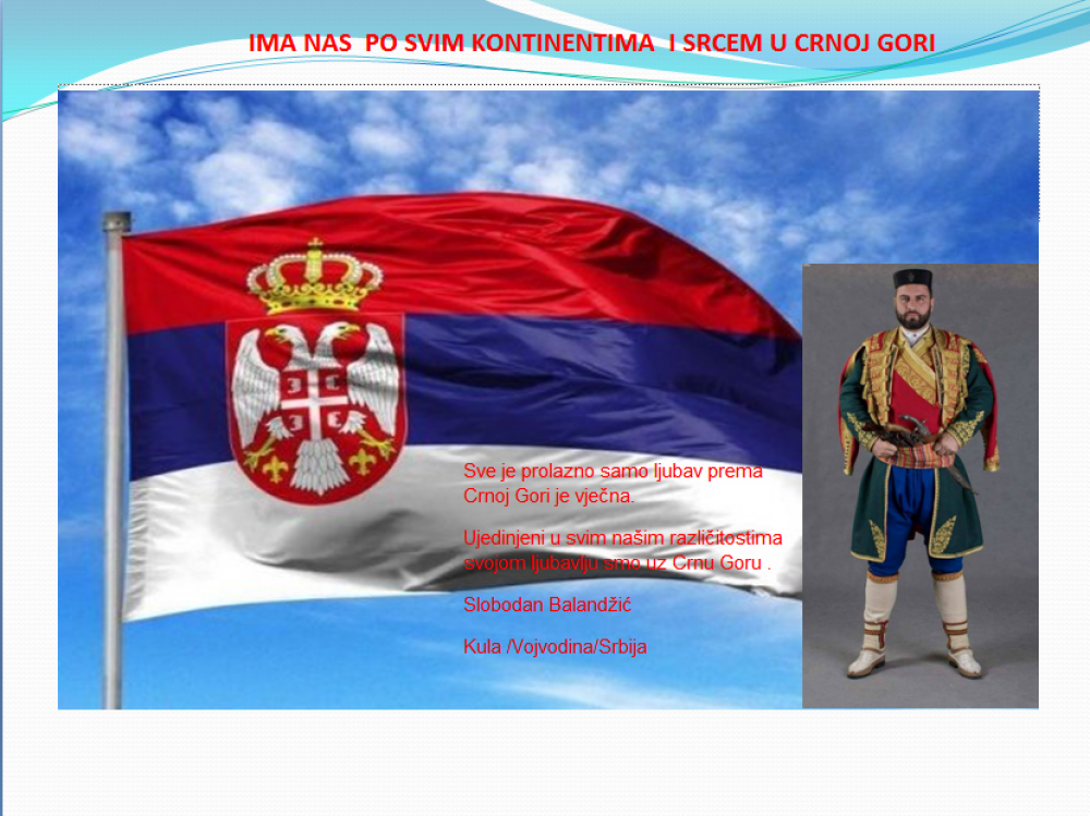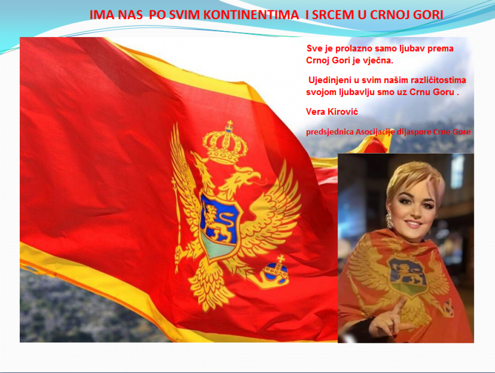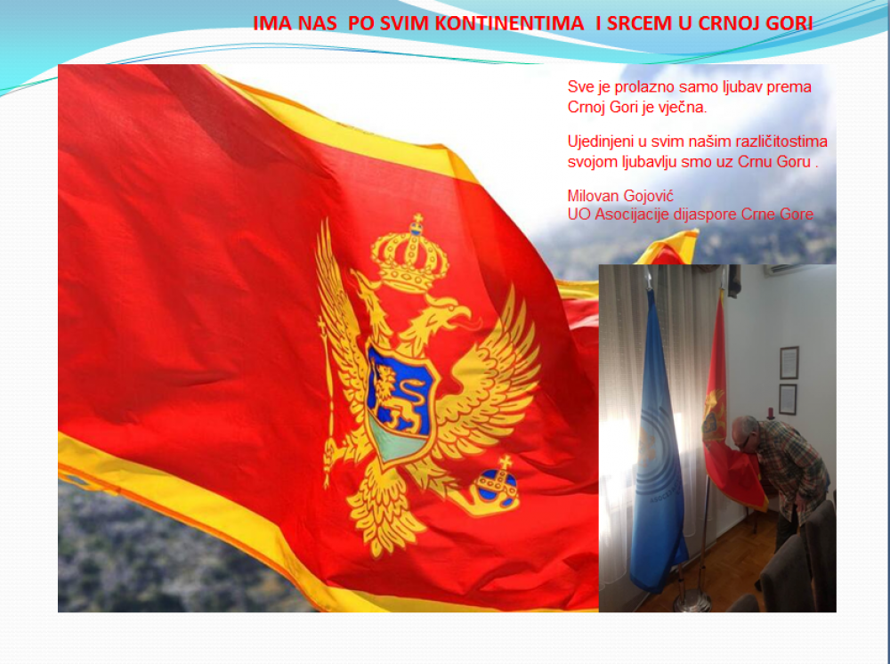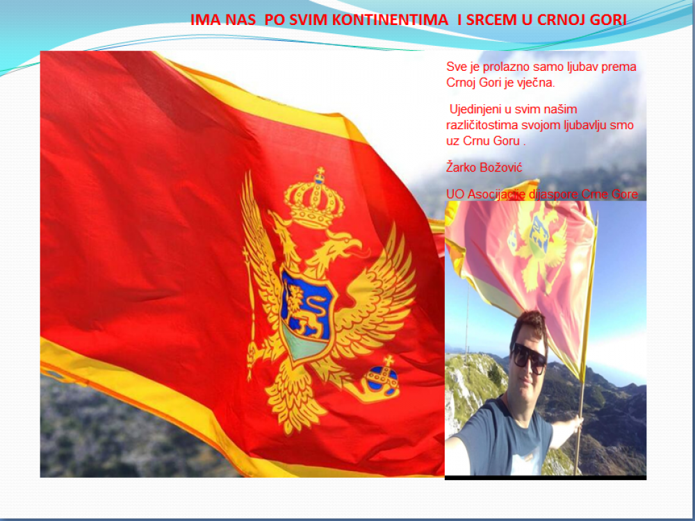 Okrenite se budućnosti, širite ljubav i bez obzira na sve vaše/naše lične pripadnosti , pripadnost Crnoj Gori se jedino mjeri samo ljubavlju prema njoj i ne zaboravite da NAS IMA PO SVIM KONTINENTIMA I SRCEM U CRNOJ GORI.