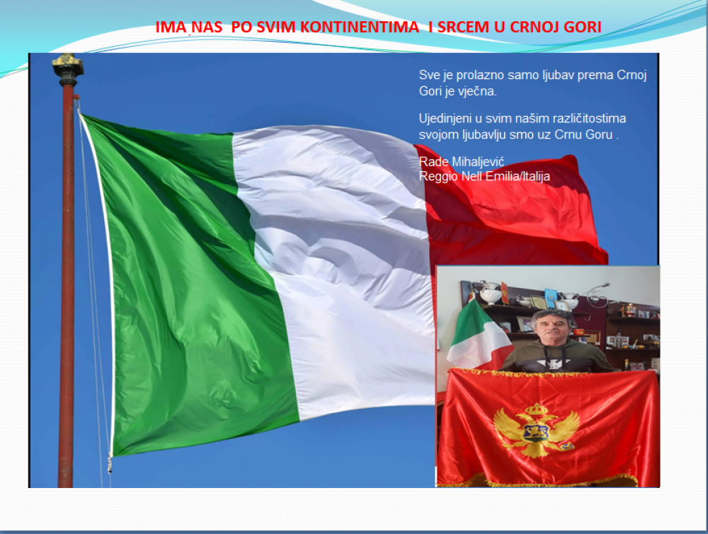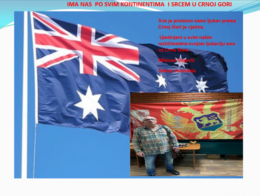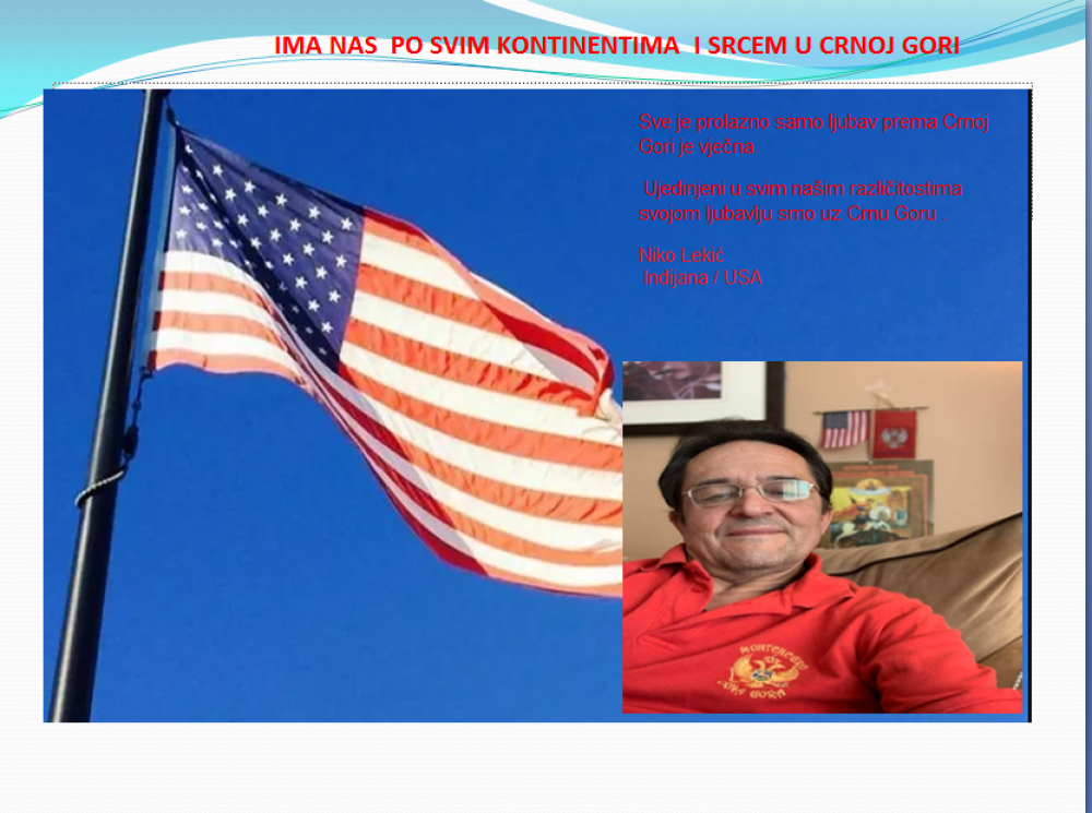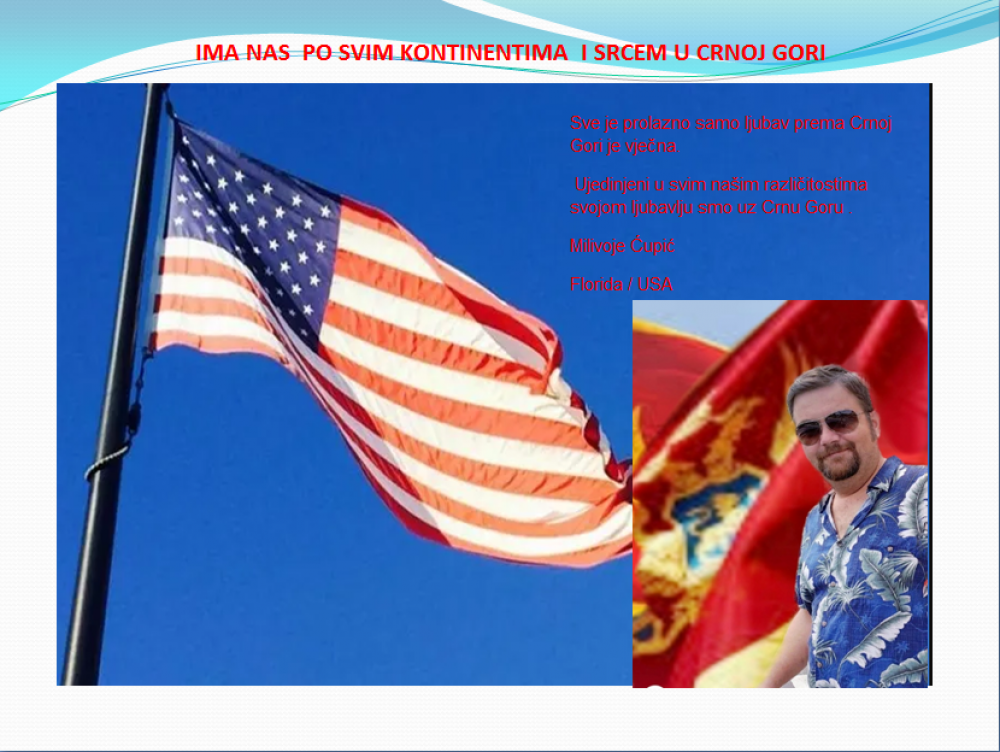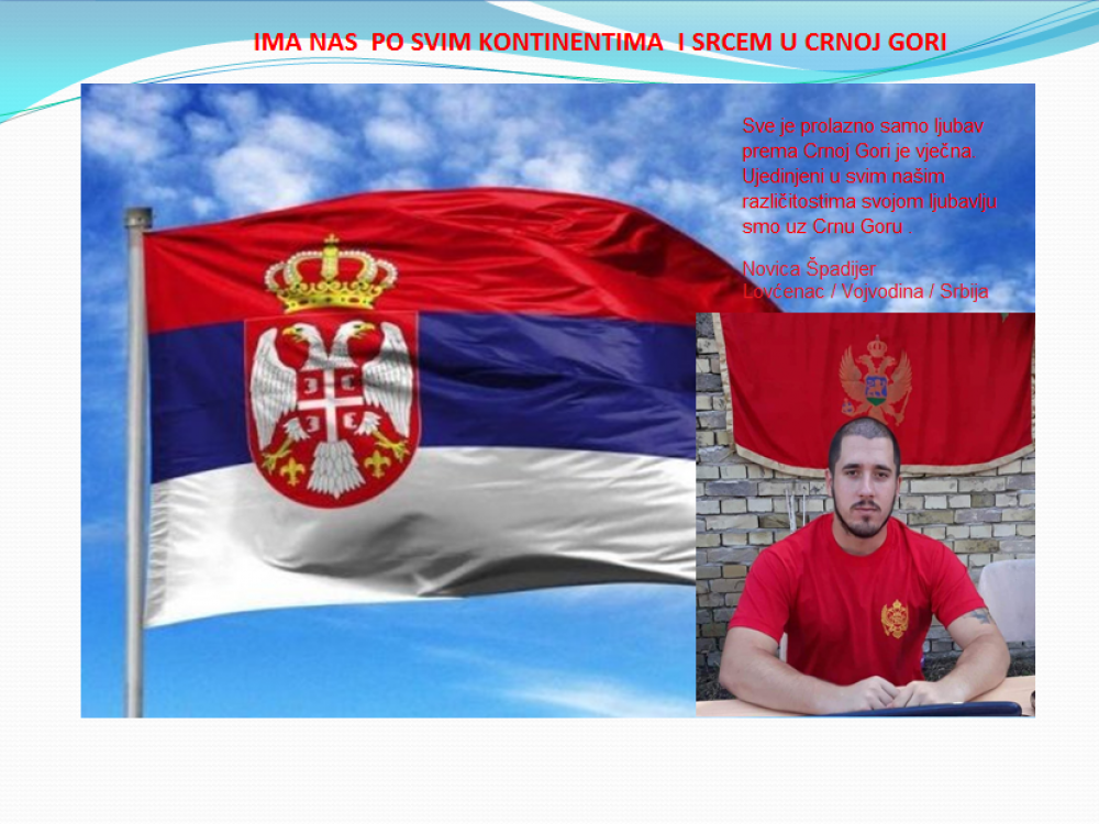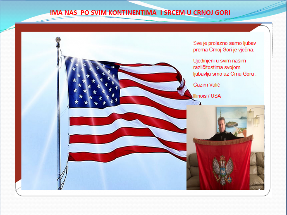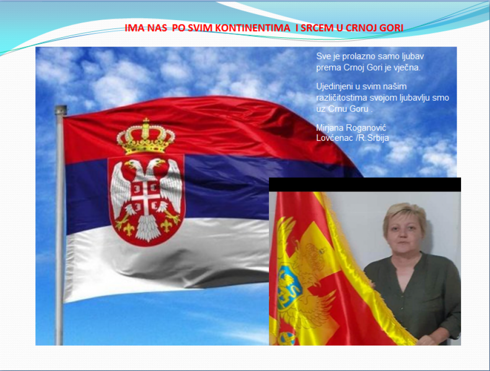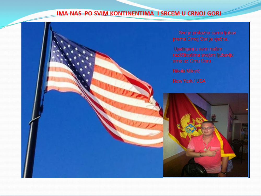 Okrenite se budućnosti, širite ljubav i bez obzira na sve vaše/naše lične pripadnosti , pripadnost Crnoj Gori se jedino mjeri samo ljubavlju prema njoj i ne zaboravite da NAS IMA PO SVIM KONTINENTIMA I SRCEM U CRNOJ GORI.