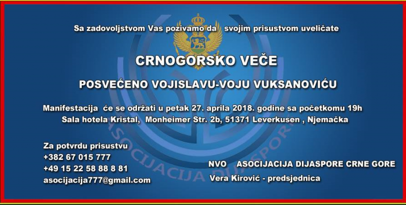 Upravni Odbor „Asocijacije dijaspore“ je jednoglasno odlučio da prvo CRNOGORSKO VEČE bude organizovano u Njemačkoj i bude posvećeno gospodinu Vojislavu-Voju Vuksanoviću koji je svojim radom i zalaganjem dao ogroman doprinos u jačanju veza iseljenika iz Crne Gore sa matičnom državom , koji je promovisao Crnu Goru u Njemačkoj u kojoj živi i koji je zbog mnogih svojih patriotskih aktivnosti u cilju zbližavanja i povećanja saradnje izmedju Crne Gore i Njemačke dobio više priznanja i nagrada od Njemačke države.