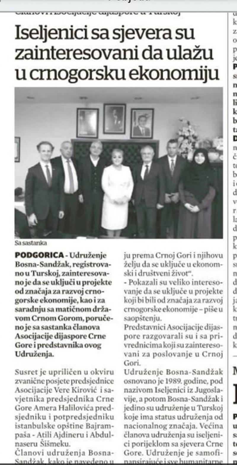 PODGORICA - Udruženje Bosna - Sandžak, registrovano u Turskoj, zainteresovano je da se uključi u projekte od značaja za razvoj crnogorske ekonomije, kao i za saradnju sa matičnom državom Crnom Gorom, poručeno je sa sastanka članova Asocijacije dijaspore Crne Gore i predstavnika ovog udruženja, gospođe Vere Kirović.