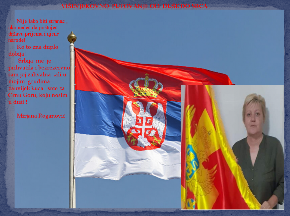 Čežnja, ljubav i želja za Crnom Gorom je svakim danom veća, njoj se uvijek vraćam kad mi to životne okolnosti dozvoljavaju, jer Crna Gora je zvijezda vodilja koja nas drži ponosne kroz vjekovnu istoriju. Crna Gora je naša svjetlost kroz tamu, duboka i trajna vjera na čemu gradimo sve svoje pripadnosti i svoje rodoljublje” su riječi sa kojima je ponosna Crnogorka iz Lovćenca Mirjana Roganović završila svoju priču o životu tamo i vječitoj čežnji za ovo ođe.