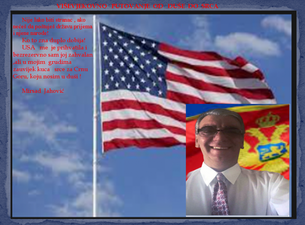 “Zavjet Crnogorskih iseljenika, je vazda bio “poštuj tuđe, a svojim se diči “ bez obzira na sva loša vremena koja smo prošli i loša dešavanja kroz koja sada prolazi Crna Gora .Volio bih da svi mi rođeni u Crnoj Gori i naši nasljednici , bez obzira đe živimo da se pridržavamo ovog načela”sa ovim riječima je svoju životnu priču počeo Crnogorski iseljenik Mirsad Jahović , koji od 1979.godine živi u USA.
