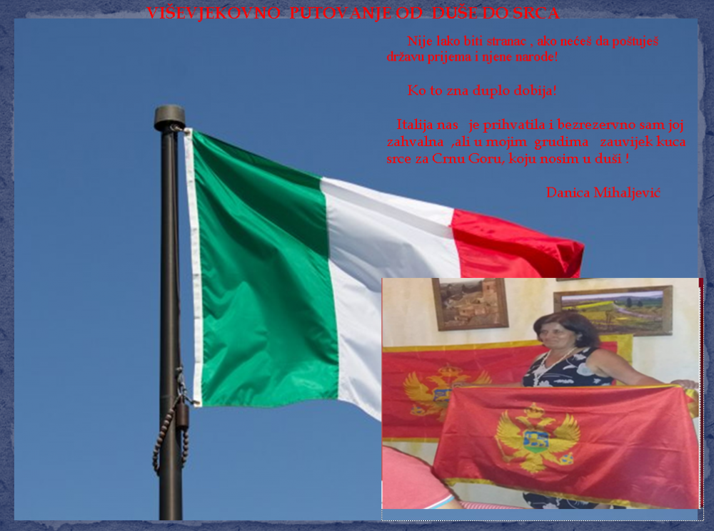 XVIII VIŠEVJEKOVNO PUTOVANJE OD DUŠE DO SRCA CRNOGORSKI ISELJENICI U ITALIJI –"OSJEĆAM SE SAMO KAO CRNOGORAC , ZATO I IMAM SAMO CRNOGORSKO DRŽAVLJANSTVO“
