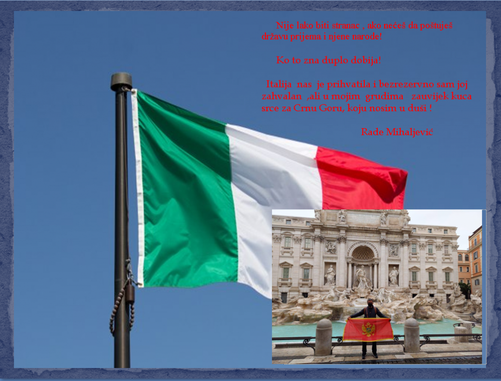 U Crnu Goru dolazim ne na odmor , već dolazim svojoj kući i bez obzira na sve ljepote Italije , jedino ođe osjećam sve svoje pripadnosti u koje su utkane sve ljepote Crne Gore.Volio bih da se Crnogorci ne udaljavaju od Crne Gore,da se svi koji je nosimo u srcu , bez obzira kojoj religiji pripadamo se ujedinimo , jer bez patriota i ljudi koji bi život dali za Crnu Goru , ne može se čuvati država koju su nam u amanet ostavili preci.Nijesu je nama ostavili, da bi je mi prepustili mrziteljima svega Crnogorskog . Podržavao sam i podržavaću suverenistički blok , koji se u zadnje ustručava da kaže glasno OVO JE CRNA GORA u koju su hrlile i razne vojske i razne politike koje su domicilno stanovnIštvo desetkovali, materijalna dobra uništavali I pljačkali, iza sebe pustoš ostavljali . I uvijek su na kraju Crnu Goru poraženi napuštali. I danas kad je Crna Gora i Crnogorci prepuštena na ne/milost srpskih klero-fašista , koji na sve moguće načine pokušavaju Crnogorcima oduzeti ljudska prava , pravo na slobodu, pravo na državu, pravo na jezik i kulturu , naciju i istoriju znam da će Crna Gora i Crnogorci sa autohtonim manjinskim narodima koji nemaju “rezervnu” državu i Crnu Goru nose u srcu ,neće dozvoliti da budu pregaženi, asimilovani i od Evropske Unije izolovani , jer ISKRU SLOBODE Crnogorskog naroda nijesu mogle i neće ugasiti ni uzurpacije, ni torture, ni domaći ni strani neprijatelji , ni vještačke podjele izazvane “zarad opstanka ili dolaska na vlasti” je poruka kojom je svoju priču o životu u Italiji koji nije umanjio brigu i vjeru u Crnu Goru završio Rade Mihaljević.